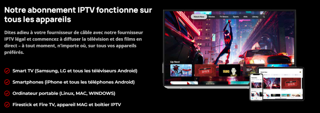 - Grâce à l’IPTV, vous pouvez accéder à vos programmes préférés où que vous soyez, tant que vous disposez d’une connexion Internet. Que ce soit à la maison, au bureau ou en déplacement, vous pouvez utiliser votre abonnement IPTV sur plusieurs appareils comme les smartphones, les tablettes, ou même les ordinateurs portables.